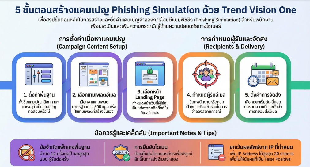 สำหรับ Trend Micro นั้น Phishing Simulation มีอยู่ที่ Trend Micro Vision One ในส่วนของ Cyber Risk Assessment โดยมีกระบวนการทำงาน ดังนี้